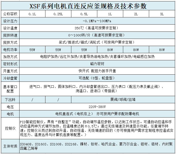 主要材料:釜體材料主要采用0Cr18Ni9(304),00Cr17Ni14Mo2(316L),1Cr18Ni9Ti(321),并可根據(jù)不同介質(zhì)要求制作鈦材(TA2),鎳及鎳合金,鉭材,鋯材,哈氏合金(C-276,C-22,B-2)